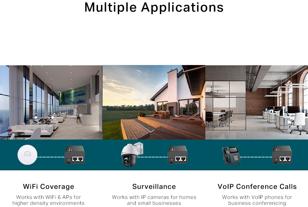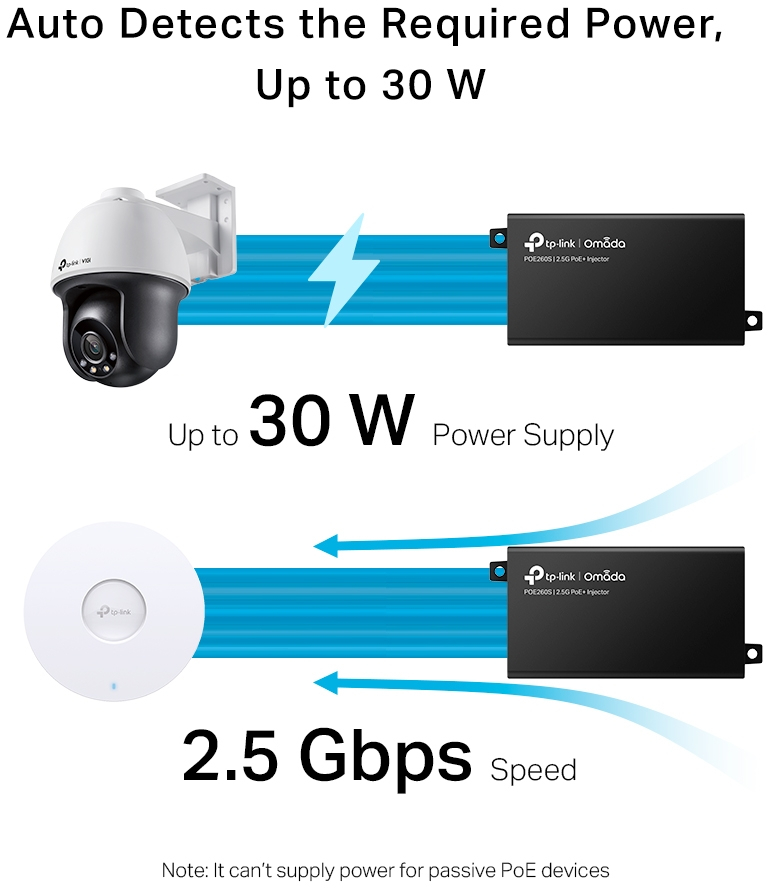 2.5G PoE+ Injector POE260S (TL-POE260S) полностью соответствует стандартам IEEE 802.3af/at и может работать со всеми PD (активными устройствами) или другими эквивалентными продуктами, чтобы расширить вашу сеть там, где нет линии питания или розетки, где вы хотите исправить устройство, такие как 2.5G ТД, HD IP камера, IP-телефон и т.д.