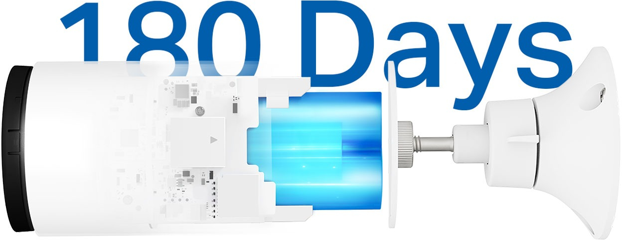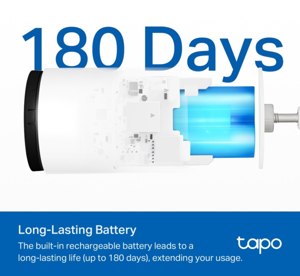 Благодаря встроенной аккумуляторной батарее Tapo C410 уменьшает частоту подзарядки, обеспечивая до 180 дней бесперебойной работы на одном заряде.