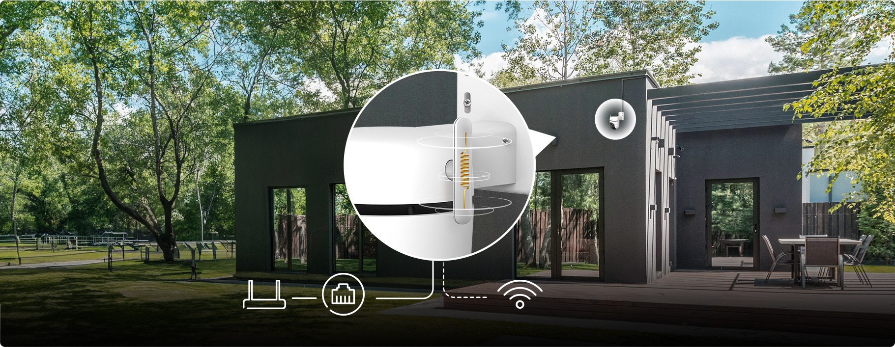 Две высокопроизводительные внешние антенны расширяют покрытие беспроводной связи на открытой местности до 150 метров*. Вы также можете подключить камеру к сети через порт Ethernet для стабильного соединения.