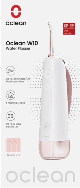 Ирригатор оснащен аккумулятором мощностью 1400 мАч. При ежедневном использовании полного заряда хватает на 30 дней активной работы, при этом эффективность Oclean W10 не падает даже при низком уровне заряда. Заряжается устройство с помощью кабеля USB Type C, который можно найти в комплекте. Благодаря длительной автономной работе ирригатор удобен в путешествиях и в повседневной жизни.