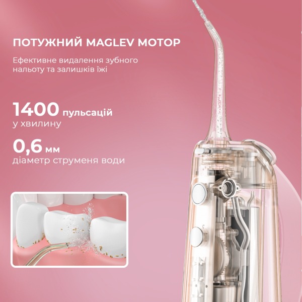 Устройство имеет резервуар для воды объемом 200 мл, что обеспечивает удобство использования без частого пополнения во время чистки. Такого объема достаточно для полноценной гигиенической процедуры, позволяя тщательно очищать зубы и десны. Резервуар легко снимается и очищается, что обеспечивает простоту ухода за ирригатором.