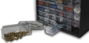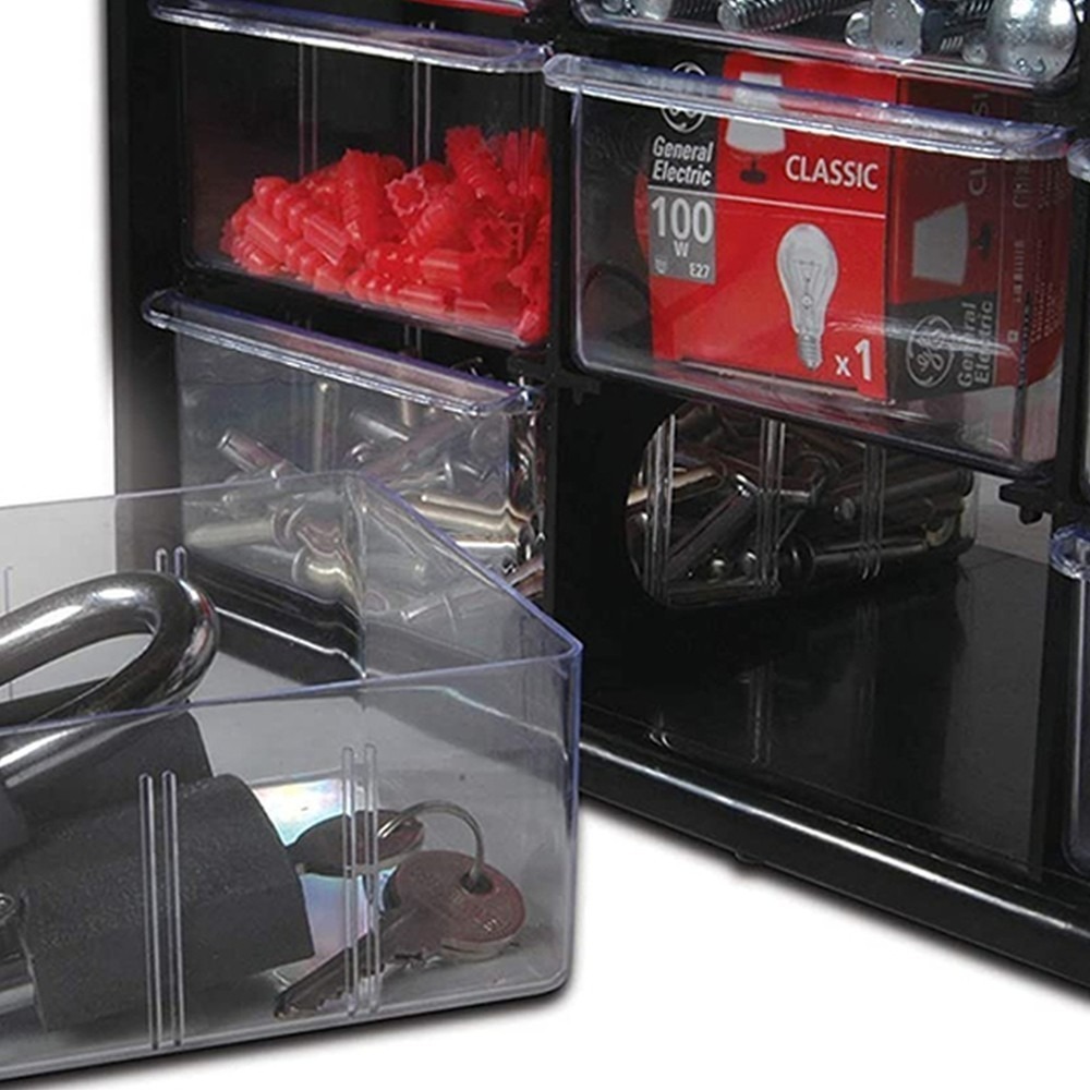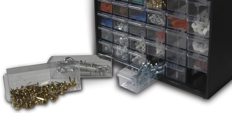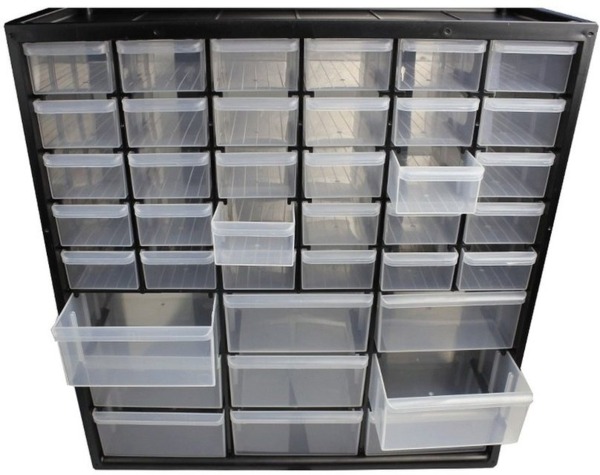Ящик имеет 39 отделений разной вместительности, одни подходят для шурупов, гаек, в других можно хранить отвертки. Открывается с помощью специальных ручек, хранить в нем инструменты и разные запчасти удобно. Посоветовал Стенли 193981 мне брат, на этом сайте нашел его, цена очень привлекла, поэтому и купил. Органайзер пластиковый, но достаточно прочный. За счет того, что шкатулки прозрачные, можно сразу найти необходимую деталь, не нужно открывать каждую. Вертикальная конструкция занимает минимум места. Конечно со временем контейнеры поцарапались, но это никак не влияет на его характеристики.