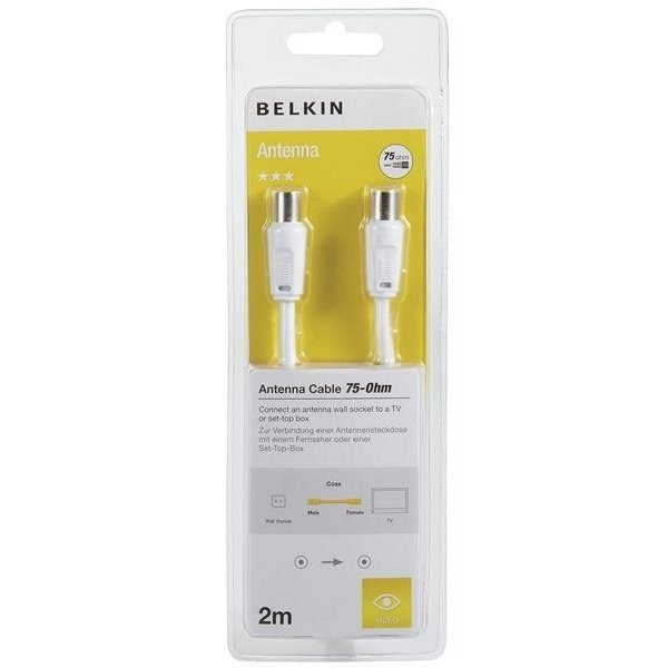 Коаксиальный телевизионный кабель для подключения внешней антенны. BELKIN (F3Y054bf2M-WHT) имеет покрытие из никеля и проводник из бескислородной меди. Длина 2м.