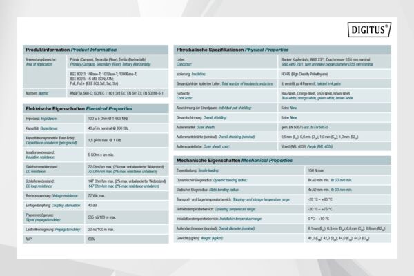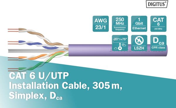 Характеристики Кабель DIGITUS CAT 6 U-UTP, 305м, AWG 23/1, LSZH Dca, фиолетовый (DK-1614-VH-305)