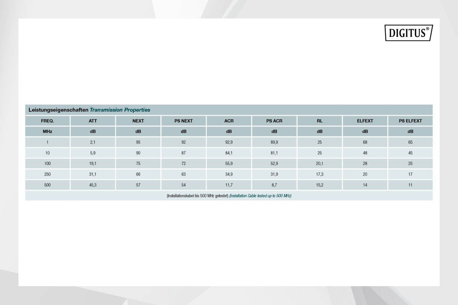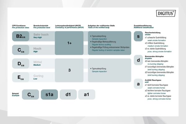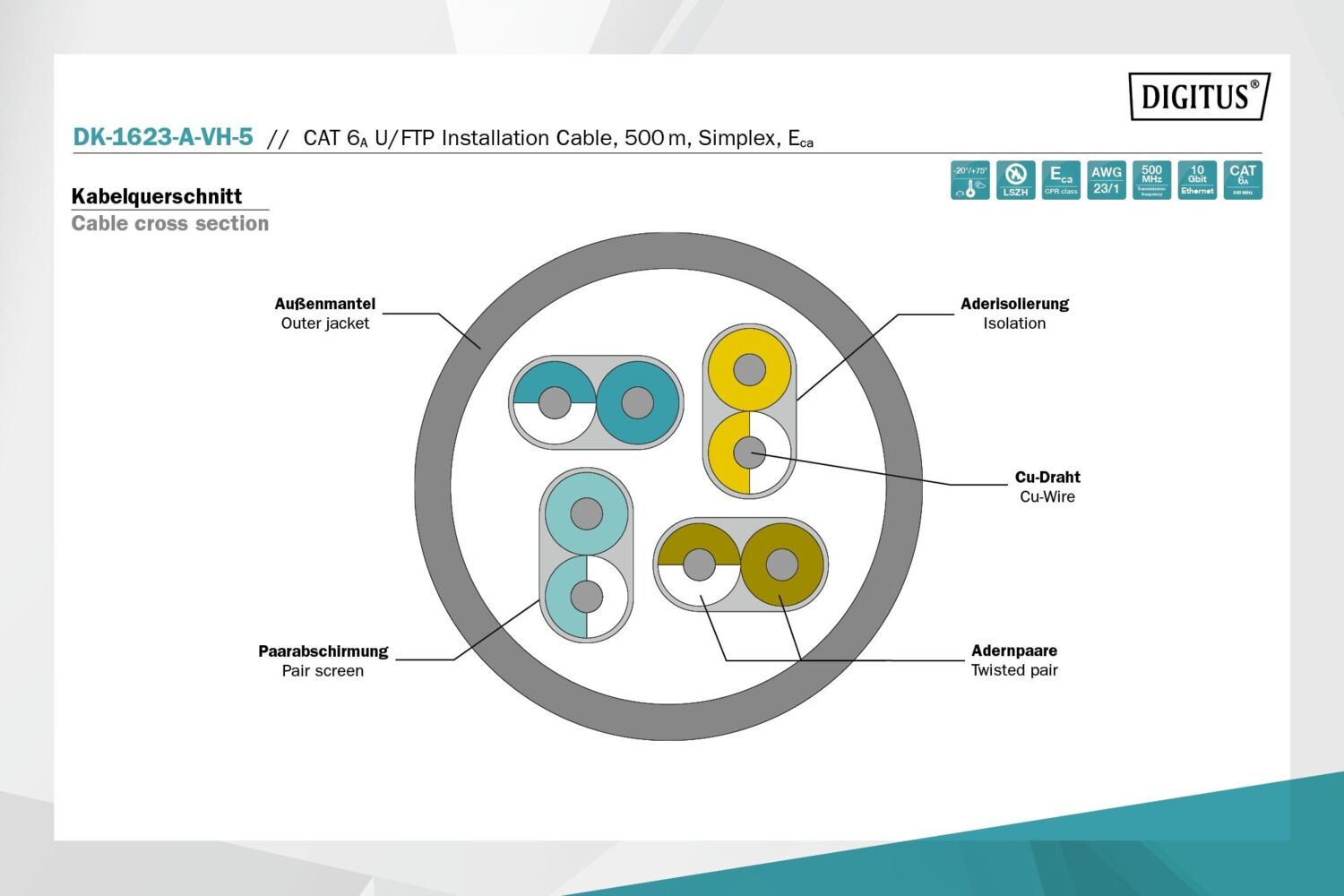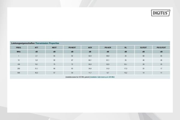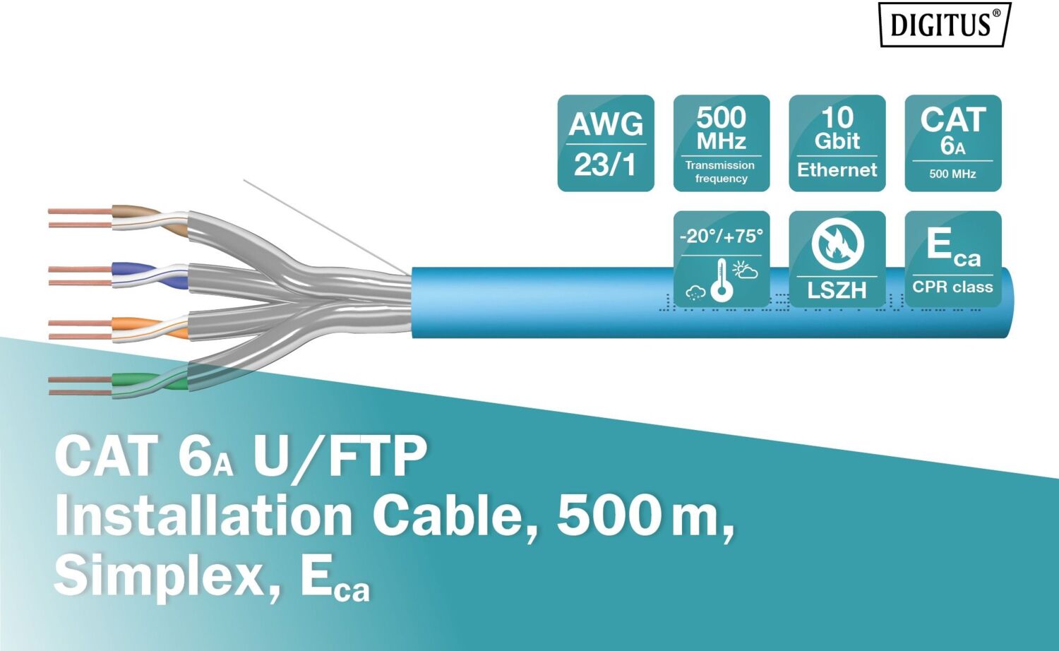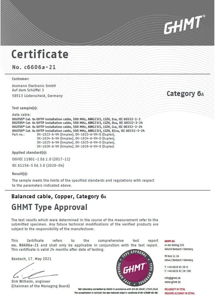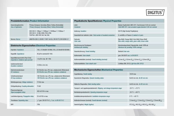 Инсталляционный кабель Digitus Cat 6A U-FTP характеризуется конструкцией кабеля 4x2x AWG23/1 и достигает частоты передачи до 500 МГц. Безгалогенная оболочка кабеля соответствует стандартам IEC 60332-1, FRNC-B, LSZH-1 и CPR Euro class Cca. Кабель подходит для построения структурированных кабельных систем во вторичном и третичном секторе. Соответствует стандартам ISO/IEC 11801, DIN EN 50173, DIN EN 50288-10-1.