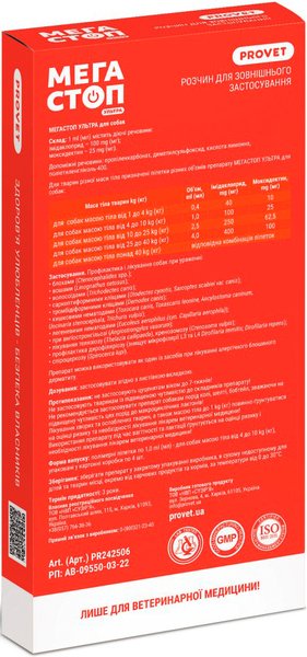 - Капли на холку для собак 4-10кг ProVET Мегастоп Ультра от внешних и внутренних паразитов 4 пипетки по 1мл