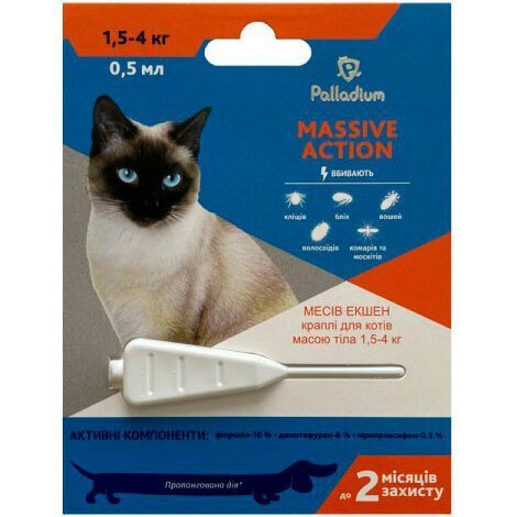 Капли на холку для кошек Palladium Massive Action - инсектоакарицидный препарат, который предназначен для уничтожения блох, иксодовых клещей, вшей и власоедов, паразитирующих на животных, а также для защиты от заболеваний, которые переносят эти паразиты.