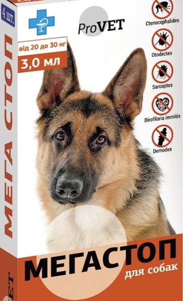 Капли от внешних и внутренних паразитов ProVET Мегастоп для собак массой тела от 20 до 30 кг, 4 пипетки по 3,0 мл