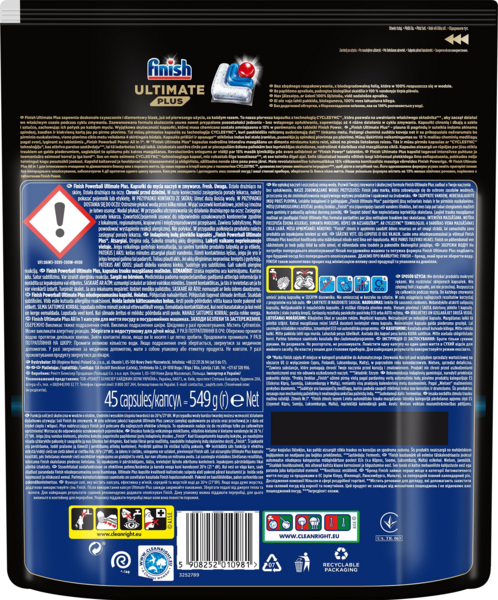 Капсулы защищают и ухаживают за вашей стеклянной посудой и вашими столовыми приборами, сохраняя их блеск после мытья. Наша уникальная формула содержит на 15% меньше химических веществ, по сравнению с таблетками Finish Power. Капсулы без дополнительной обертки, с биоразлагаемой пленкой, которая на 100% растворяется в воде.