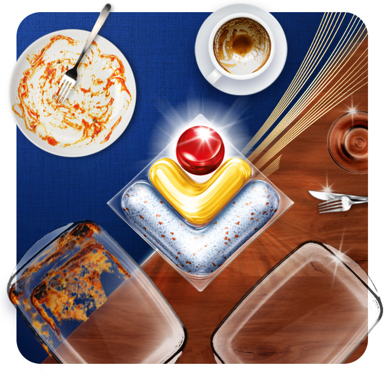 - Капсулы для посудомоечной машины с технологией Cyclesync позволяют активным компонентам действовать именно в нужный момент, эффективно удаляя даже пригоревшие остатки пищи;