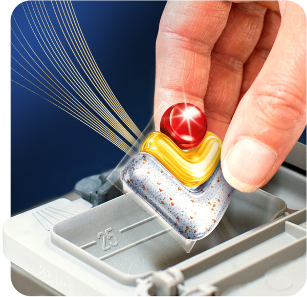 - Поместите одну капсулу на один цикл мытья в сухой отсек для моющего средства;