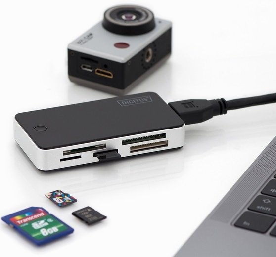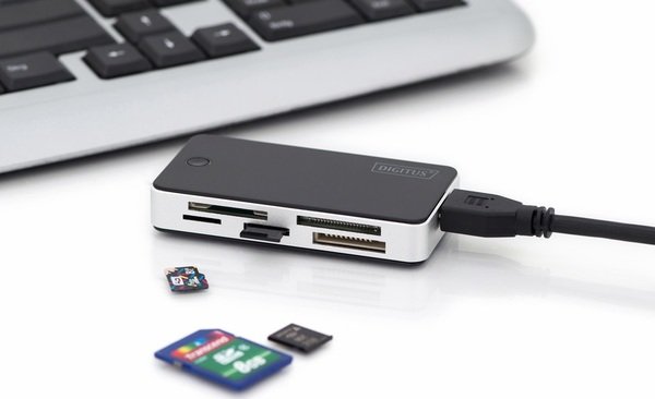Универсальное устройство считывания карт DIGITUS USB 3.0 позволяет максимально быстро перенести данные на персональный компьютер или компьютер Mac. Можно использовать любые традиционные карты памяти.