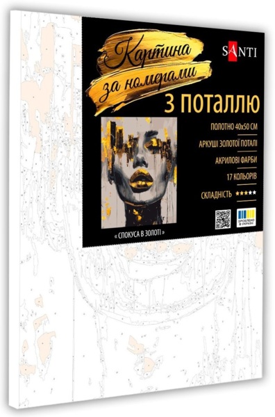Картина по номерам Santi "Искушение в золоте" с поталью — это возможность создать живописный шедевр без специальной подготовки. Следуя пронумерованным контурам на холсте и используя качественные акриловые краски, вы легко воссоздадите увлекательный сюжет. Золотая поталь придаст картине изысканный блеск и выразительность, а мерцающий эффект золота наполнит ваш интерьер атмосферой роскоши и элегантности. Набор для живописи по номерам безопасен и экологически чист — изготовлен из натуральных материалов.