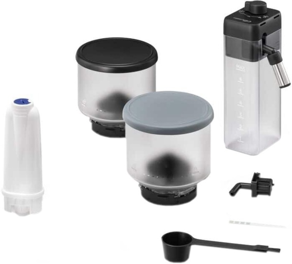 | Комплектация (возможны изменения в разных поставках) | Документация, Контейнер для зерен - 2 шт., Контейнер для молока, Кофемашина, Мерная ложка, Носик для воды, Резервуар для воды, Тестовая полоска для определения жесткости воды, Фильтр |