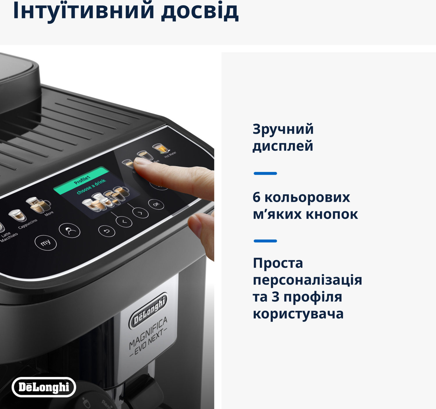 Откройте для себя широкое меню напитков и легко управляйте кофемашиной на цветном TFT-дисплее, который делает управление устройством чрезвычайно интуитивным и приятным.