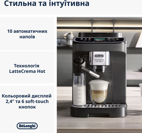 Кофемашина DeLonghi Magnifica Evo Next сочетает в себе инновационные функции и простоту использования, чтобы каждый день радовать вас чашкой идеально приготовленного кофе.