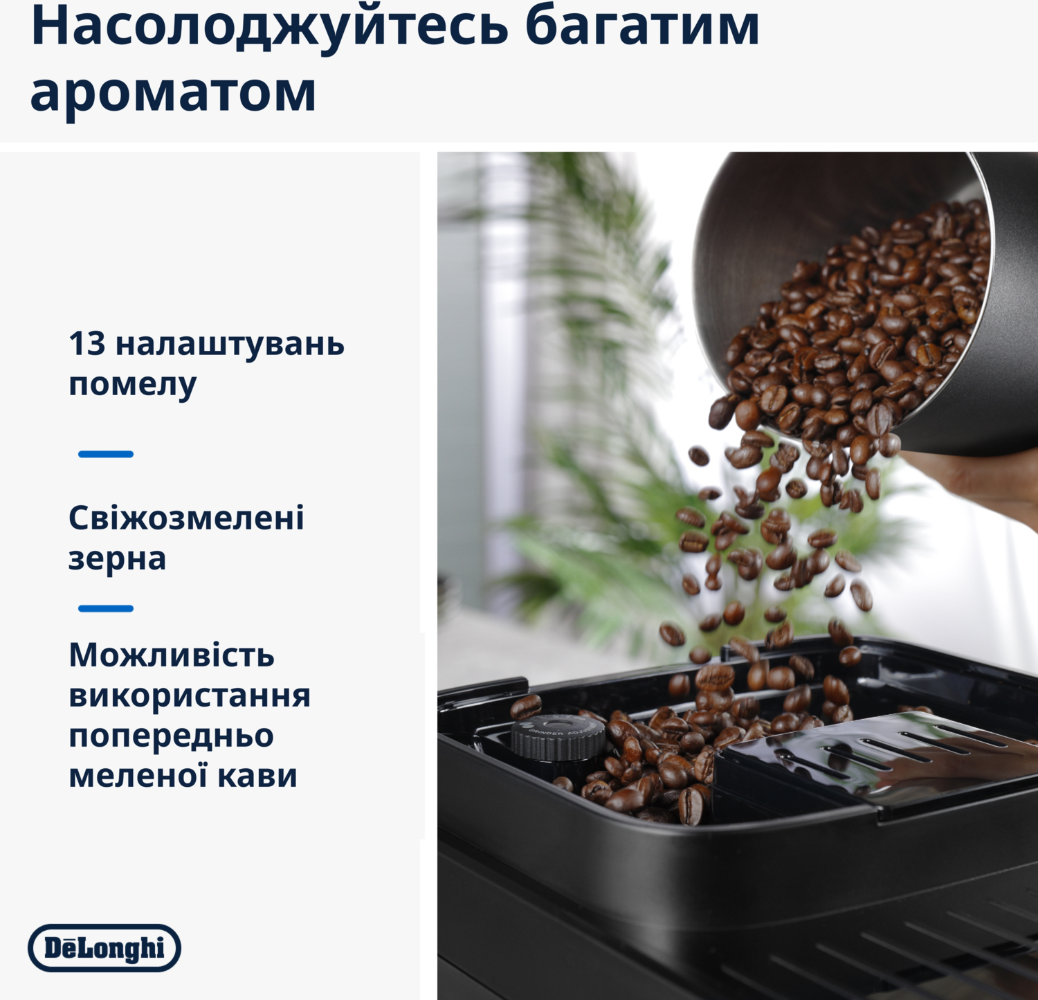 Контейнер вмещает до 250 г зерен, поэтому вам не придется часто его наполнять. Если вы хотите получить большую порцию классического итальянского кофе, приготовьте двойное эспрессо одним касанием. Всегда идеально сваренный, благодаря встроенной стальной кофемолке с 13 уровнями регулировки помола. Кроме того, оптимальное давление, создаваемое во время процесса заваривания кофе, гарантирует его насыщенный и интенсивный аромат.