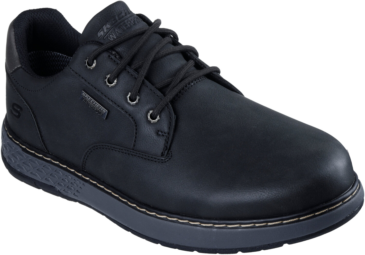 Классический стиль и комфорт - в Skechers Relaxed Fit: Garlan - Pryor. Водонепроницаемый верх из искусственной кожи на шнуровке, стелька Air-Cooled Memory Foam с добавлением угля и амортизация Skechers Goga Mat Arch для дополнительной поддержки.