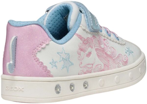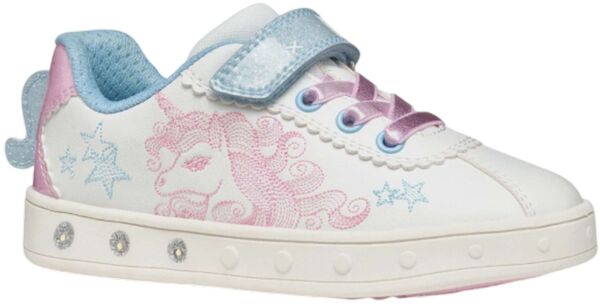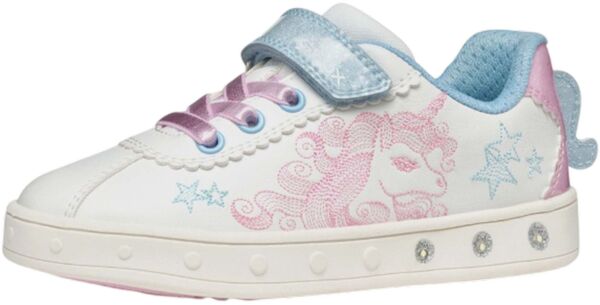 Повседневные удобные кеды для девочек с активной эстетикой и теннисным стилем жизни Geox Skylin. Женственный верх в бело-розовой цветовой гамме украшен принтованными деталями и 3D-украшениями. Изготовленные из материала с кожаным эффектом и блестящего лакированного материала, Skylin оснащены подсветкой на подошве и придадут дополнительной энергии любому образу.