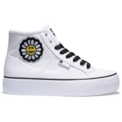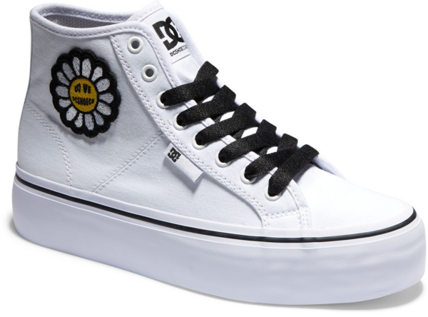 Это стильные высокие кеды DC Shoes с белым верхом, изготовленные из текстиля, что обеспечивает комфорт и легкость. На боковой части расположена вышивка в виде цветка с надписью «DC Shoes», что добавляет яркого акцента.