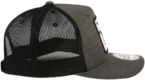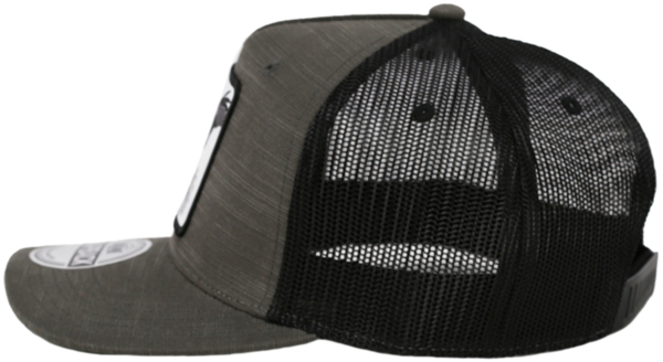 - Широкая передняя панель и козырёк выполнены из плотной ткани серого цвета, две боковые и две задние панели — из чёрного сетчатого материала;