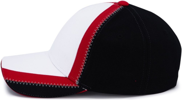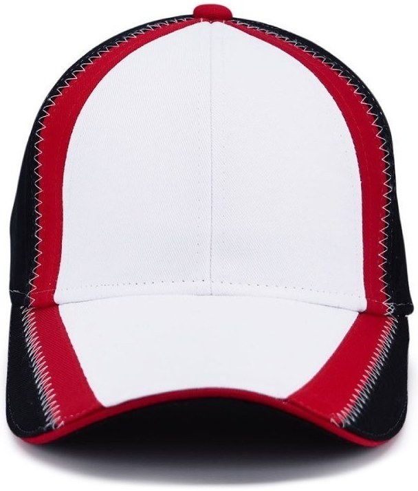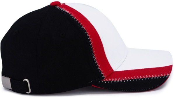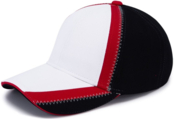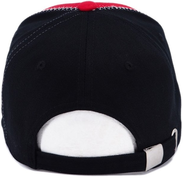 - Трехцветный дизайн придает головной убор достаточно современный вид. Между передними и боковыми панелями, а также на козырьке – контрастная дизайнерская вставка, украшенная декоративным швом;