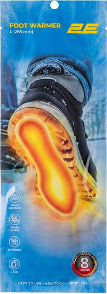 Химические грелки для ног 2E - это одноразовое, персональное средство для локального обогрева ног. Длина изделия составляет 265 мм (размер L). Время действия после активации - до 8 часов. Средняя температура грелки около 40 °C, однако максимальная может достигать 45 °C, поэтому изделие может вызвать жар, а при чрезмерном применении может вызвать локальные ожоги или раздражение кожи. Важно: если во время использования грелка-стелька слишком горячая или просто неудобная, немедленно выньте ее.