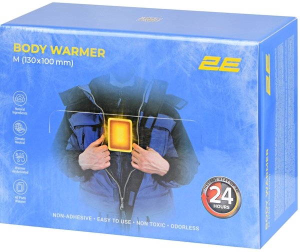 Химические грелки для тела 2E – это одноразовое, индивидуальное средство для локального обогрева. Размер изделия 130 × 100 мм. Время действия после активации – до 24 часов. Средняя температура грелки составляет приблизительно 53 °C, однако максимальная может достигать 63 °C, поэтому изделие может вызвать жар, а в случае чрезмерного применения может вызвать локальные ожоги или раздражение кожи. Важно: если при использовании грелка слишком горячая или просто неудобная, немедленно снимите ее. Грелки не требуют специальных мер по утилизации. После одноразового использования от холодных грелок можно избавиться, как от обычного бытового мусора.