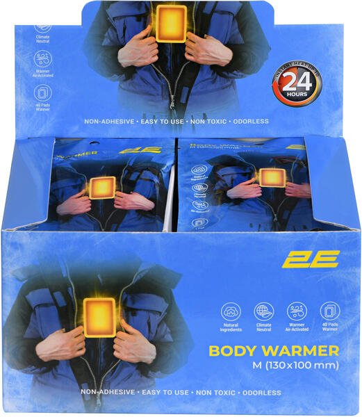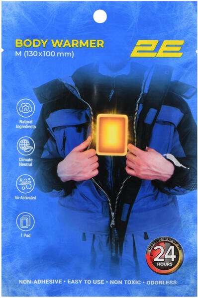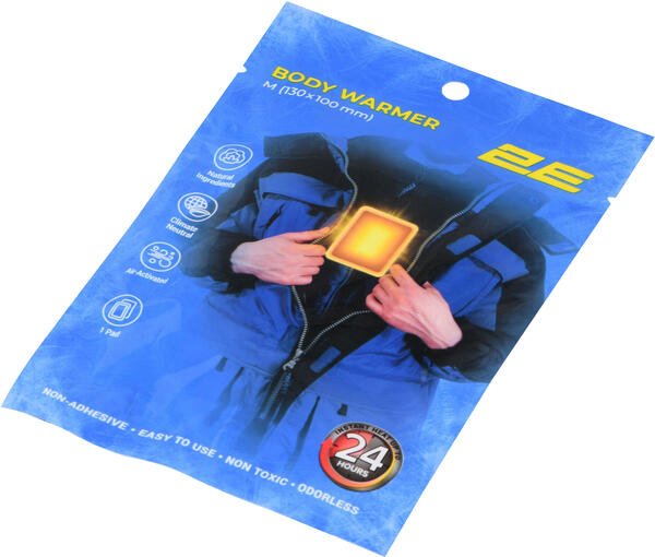 Химическая грелка для тела 2E - это одноразовое, индивидуальное средство для локального обогрева. Размер изделия 130 × 100 мм. Время действия после активации - до 24 часов. Средняя температура грелки примерно 53 °C, однако максимальная может достигать 63 °C, поэтому изделие может вызвать жар, а в случае чрезмерного применения - вызвать локальные ожоги или раздражение кожи. Важно: если во время использования грелка слишком горячая или просто неудобная, немедленно снимите ее.