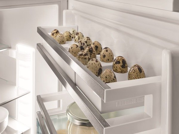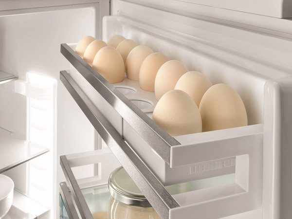 Вы любите куриные яйца? Ваш Liebherr тоже - именно поэтому он имеет лоток для яиц. Здесь можно разместить не только до 20 куриных яиц, но и до 24 перепелиных. Лоток для яиц состоит из внешней и внутренней частей, которые можно вставлять друг в друга по-разному. Перевернув лоток - используются отверстия для перепелиных яиц.