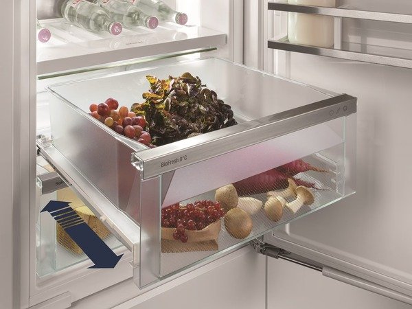 Испытайте удовольствие от открытия контейнера BioFresh: не только из-за свежих продуктов, но и потому, что они открываются очень легко, а закрываются самостоятельно и мягко. За это отвечают телескопические направляющие, которыми контейнеры плавно выезжают вам навстречу. Поскольку они выдвигаются полностью, у вас будет наилучший обзор содержимого.