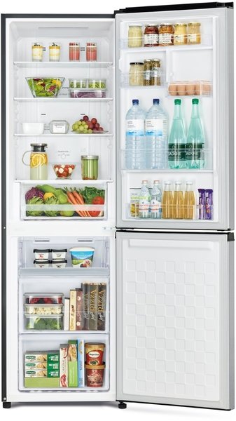 Hitachi R-V470PUC8BSL - двухкамерный холодильник на 330 литров. Система охлаждения NoFrost, гигиенический фильтр Nano Titanium. Если холодильник отключится от сети, то срабатывает функция автономного сохранения холода, который продлится до 12 часов. Отдельно стоящий двухкамерный холодильник, при достаточно компактных размерах обладает вместительным объемом.