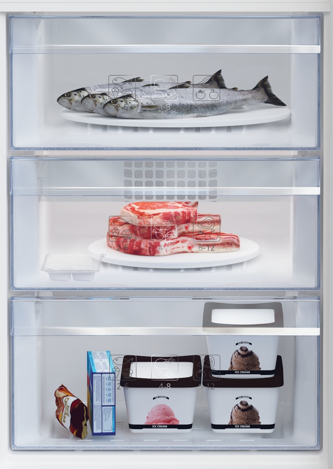 Бывает трудно увидеть все, что находится в холодильнике, особенно в углах и за полками. Светодиодное освещение имеет светодиодные ленты, расположенные в верхней части холодильника и на каждой полке на боковой стенке, поэтому вы можете четко видеть всю холодильную камеру. Оно также более энергоэффективное, чем стандартное освещение.