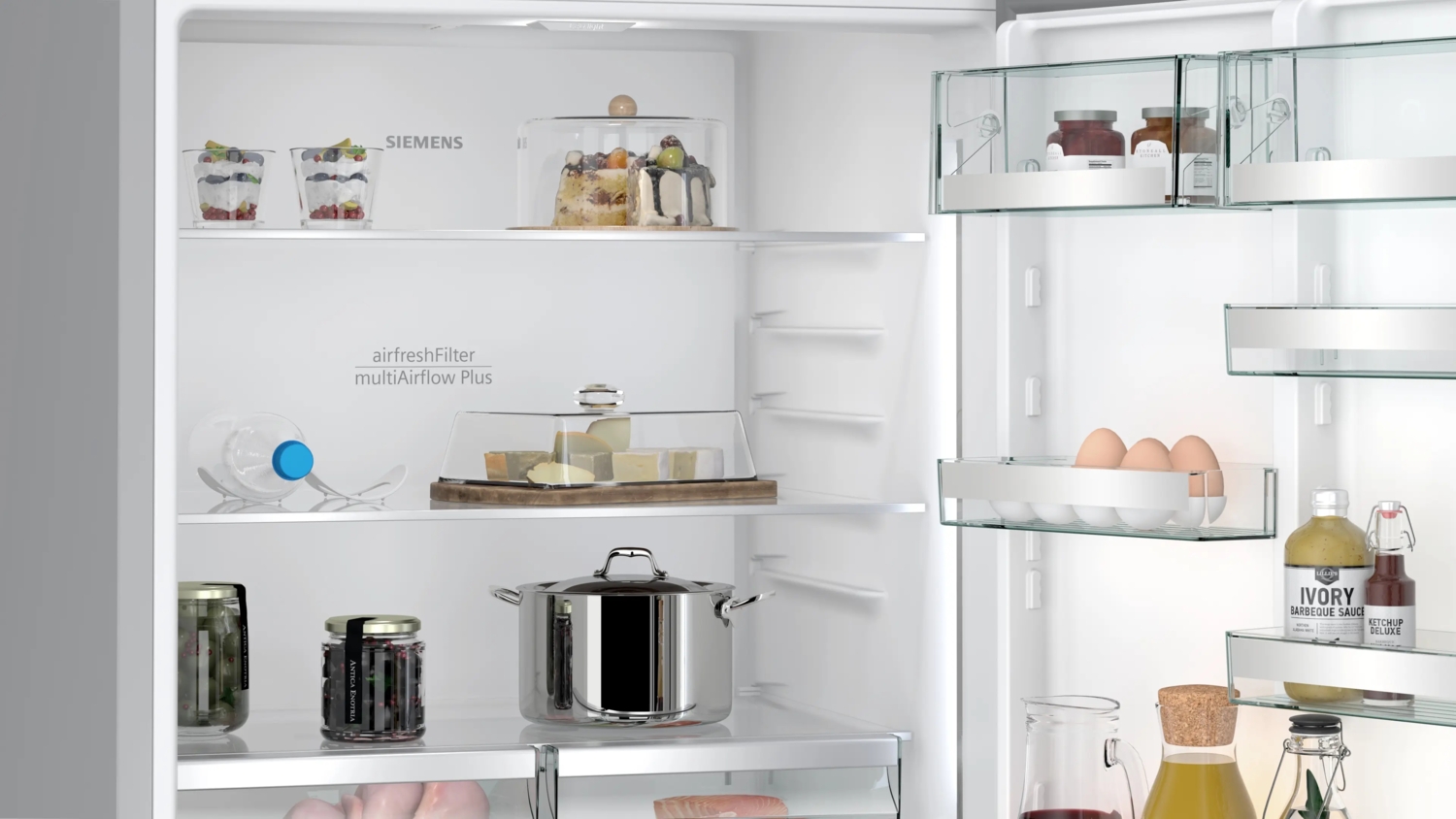 Внутреннее пространство морозильных камер холодильников Siemens может подстраиваться под ваши потребности. Так, вы можете вынуть все контейнеры и полочки, чтобы освободить место для очень объемных продуктов, например, для целого лосося или индейки.