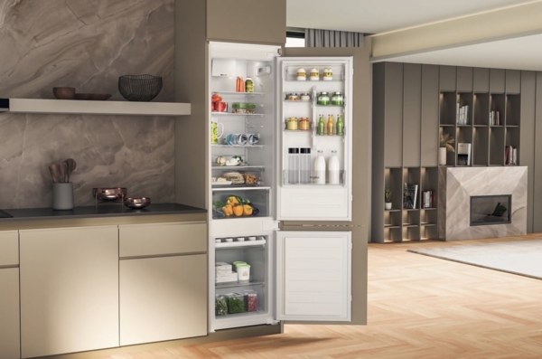 Уникальный дизайн, гарантированный эксклюзивной системой невидимых реек, полностью скрытых за дверцей холодильника.