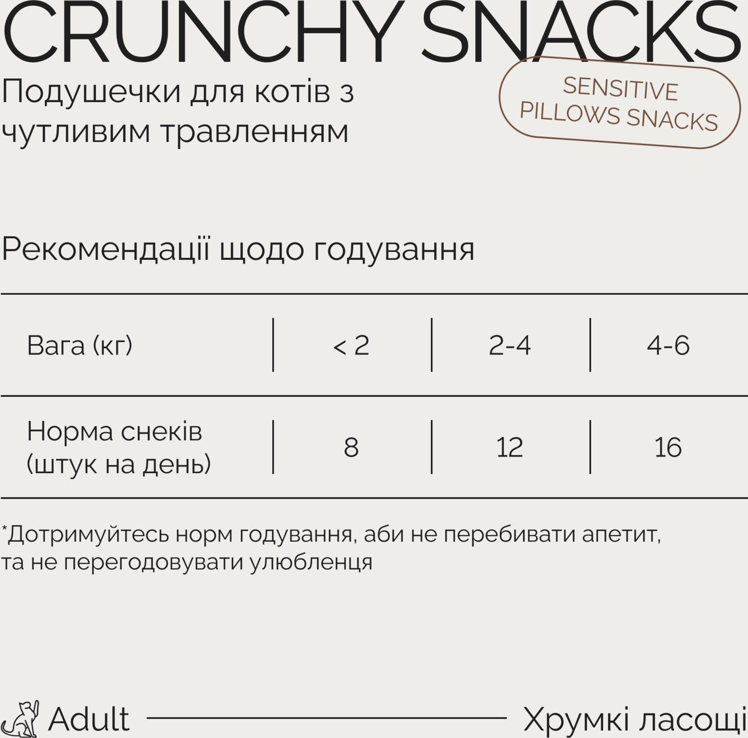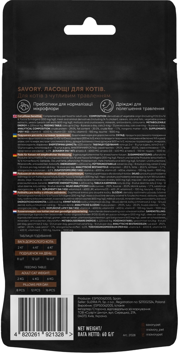 - Хрустящие лакомства для взрослых котов с чувствительным пищеварением Savory Cats Snacks Pillows Sensitive 60 г