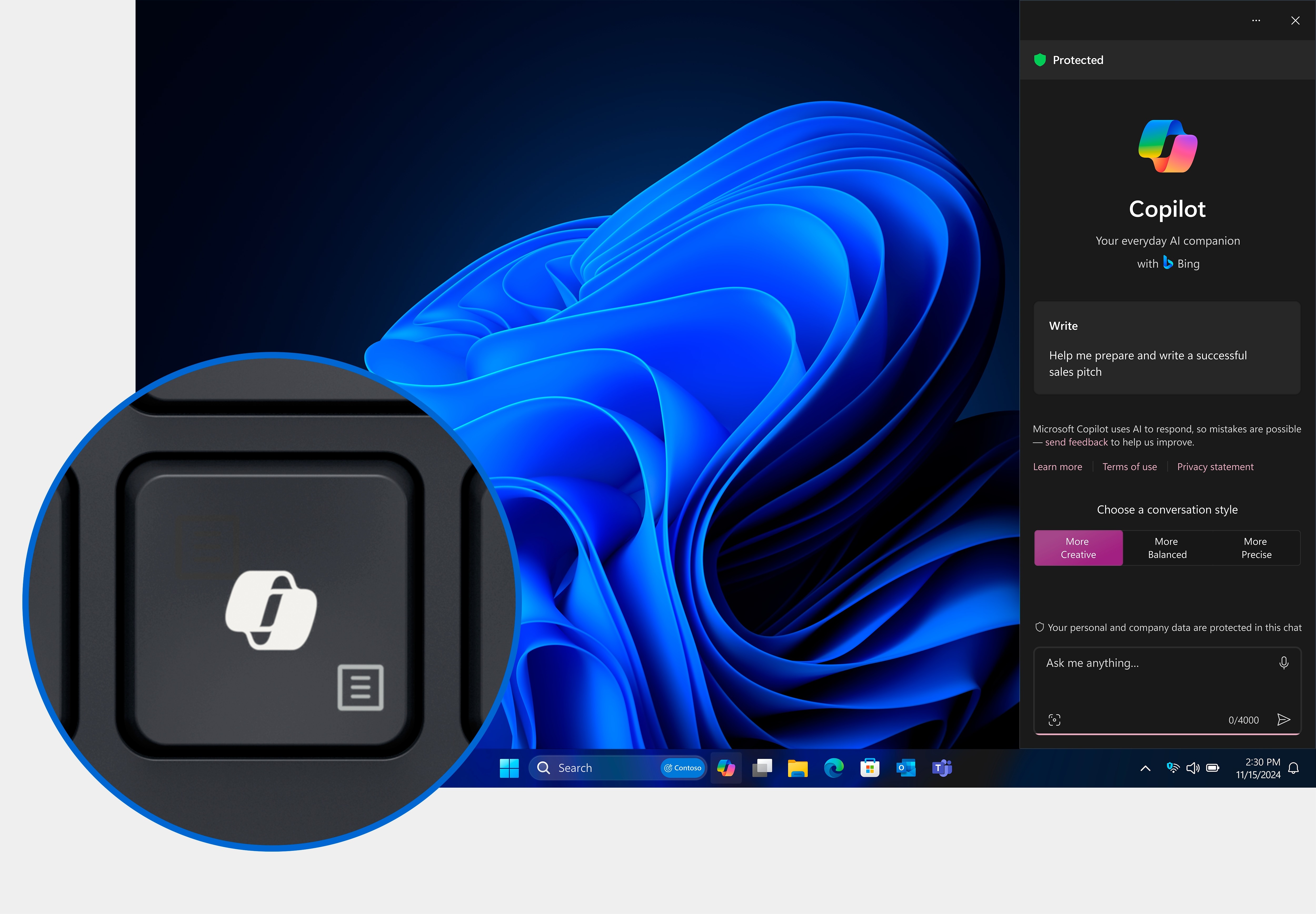 Получите быстрый доступ к Copilot в Windows, вашему повседневному помощнику с искусственным интеллектом, с помощью встроенной клавиши Copilot.