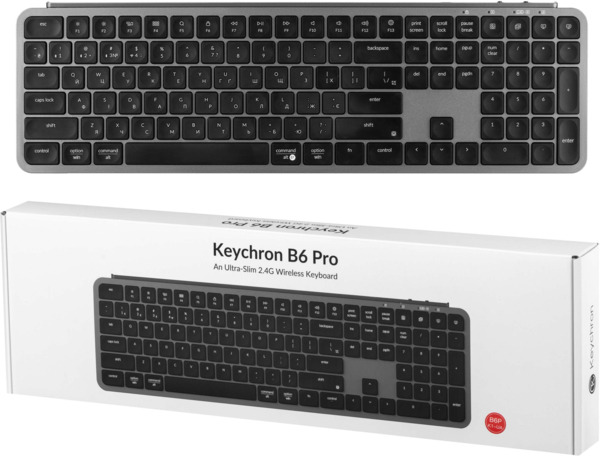 Keychron B6 Pro – зручна повноформатна клавіатура ножичного типу, що відноситься до середнього класу. Якщо потрібна тиха і продумана клавіатура у форм-факторі 100-відсоткової розкладки, що дозволяє підключати кілька пристроїв одночасно і живлення від акумулятора, то до Keychron B6 Pro варто придивитися. Це не ігрове рішення, але для щоденної роботи з великими текстами та таблицями аксесуар підходить добре. За замовчанням пропонується стандартна En-UA розкладка. Місткість батареї в Keychron B6 Pro складає 800 мАг.
