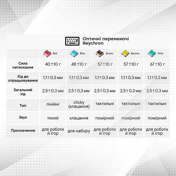 Добрий день! У цій клавіатурі встановлені коричневі світчи, вони дають відчутний тактильний ефект клацання, що допомагає уникнути помилок введення, також вимагають меншої сили натискання і набагато тихіше.
