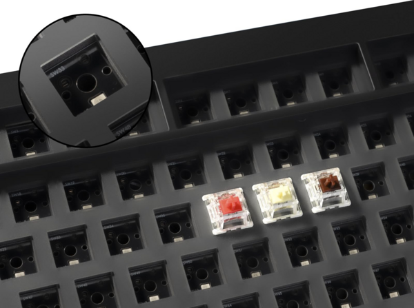 Гнезда с возможностью горячей замены установлены на печатной плате, поэтому вы можете устанавливать или менять переключатели без пайки. Печатная плата поддерживает как 3-контактные, так и 5-контактные механические переключатели MX.
