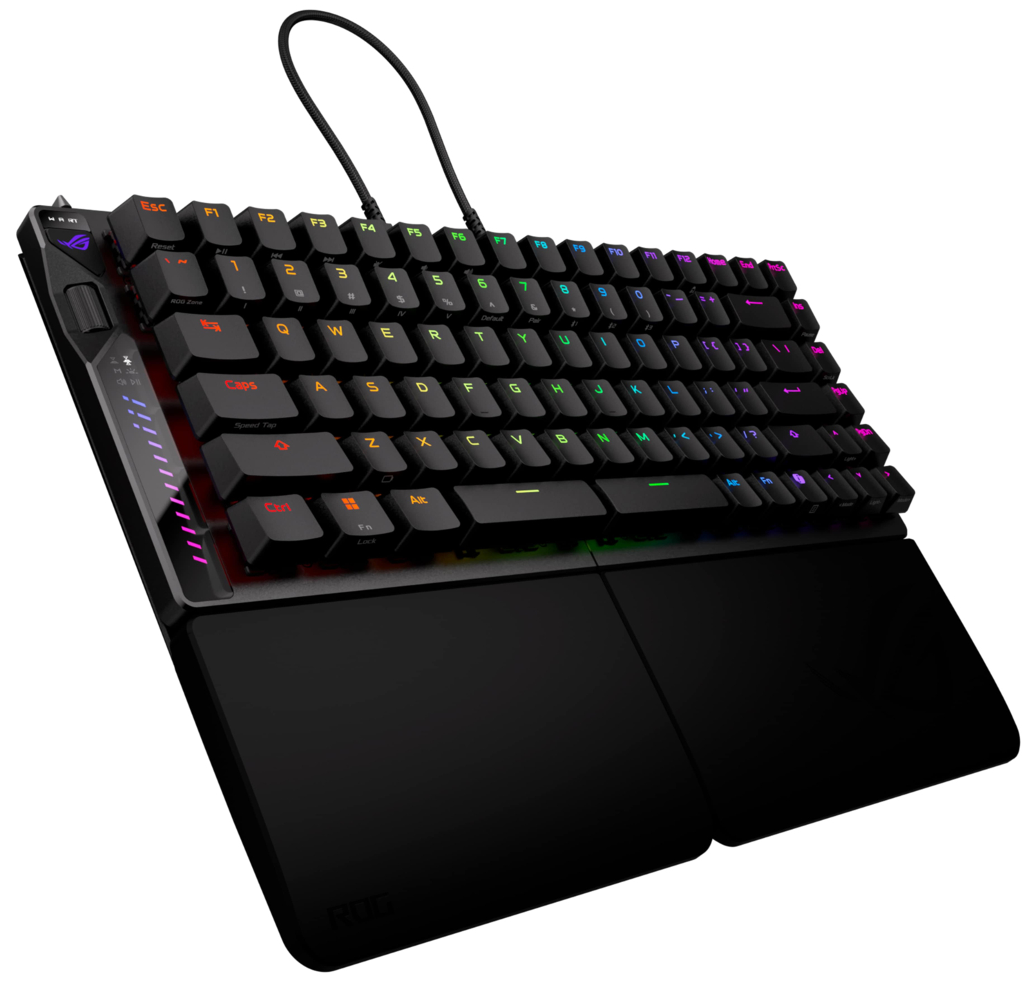 Специальный переключатель слева в верхней части ROG Falcata активирует функцию Rapid Trigger, которая обеспечивает максимально быстрый отклик на нажатие клавиш и самую высокую частоту повторного срабатывания клавиш в нажатом состоянии. Стандартно эта функция активирована только для клавиш WASD.