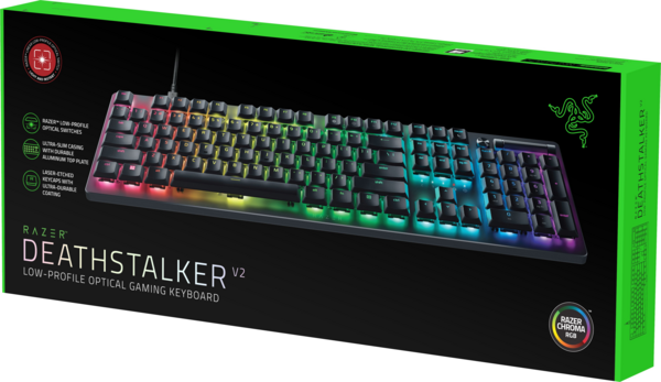 Избавьтесь от конкуренции с Razer DeathStalker V2 - ультратонкой оптической клавиатурой, оптимизированной для первоклассной производительности и долговечности. Новые низкопрофильные переключатели для сверхбыстрого реагирования на нажатия в играх, размещенные в прочном, ультратонком корпусе для длительного эргономичного использования.