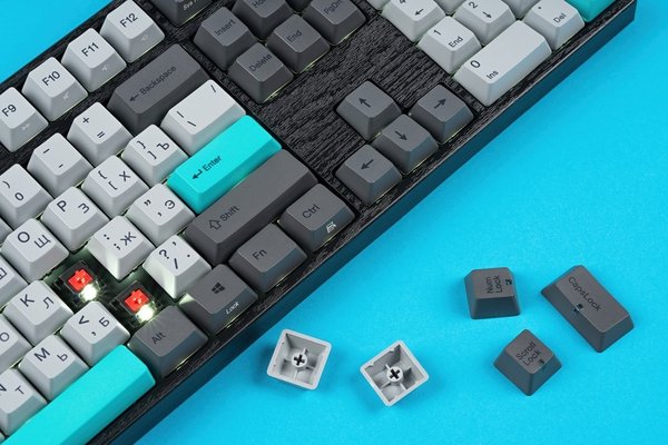 Сочетание стабилизаторов и смазки позволяет добиться максимально равномерного и плавного хода клавиш enter/space/shift/backspace, а сами клавиши легко снять с клавиатуры.