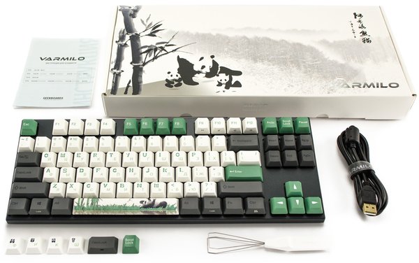 Компактная клавиатура Varmilo MA87M V2 Panda R2 имеет оригинальный дизайн в бело-зеленых тонах и рисунки панды на некоторых клавишах. Колпачки изготовлены из высокопрочного пластика PBT с применением dye-sublimation технологии с выгравированными символами на боках, использование dye-sub позволяет символам никогда не стереться и никак не чувствоваться при печати, а качественный PBT пластик гарантирует надежность и долговечность, клавиши имеют слегка текстурированный верх и приятны на ощупь.