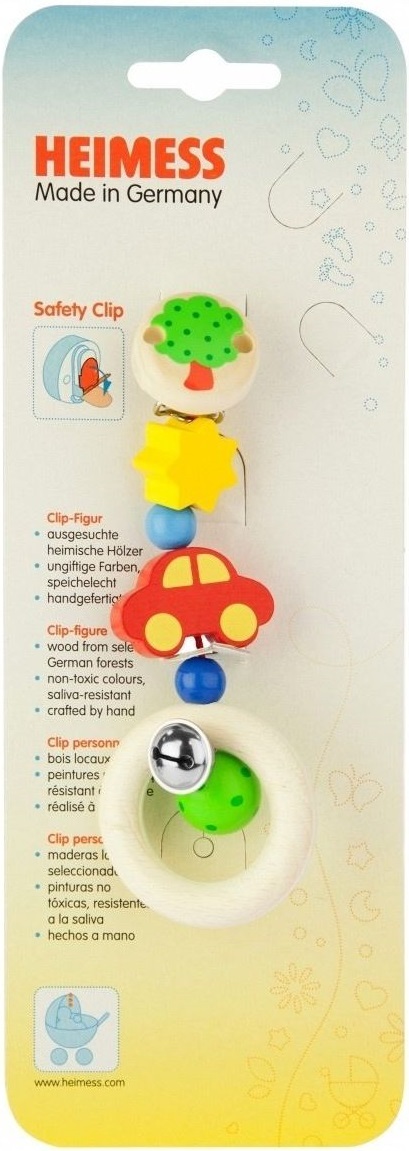 Фигурная форма очень заинтересовала малыша, постоянно хочет потрогать, рассмотреть, но снять не пытается. Вот только клипса, которой крепится аксессуар к одежде, очень тугая, к тому же металлическая, оставляет вмятины на одежде. У меня получается едва ли разогнуть, чтобы прицепить к распашонке. Зато, такая прочная хватка обеспечивает постоянное наличие пустышки на своем месте. Особенно выручает на прогулке, соска не падает на землю, не вымазывается. Здесь приобрела, клипса ХЭЙМЕЗЗ МАШИНКА по цене вполне недорогая. Мне посоветовала подруга, пользуется сама с удовольствием. Сделана из дерева, все элементы отполированы, выкрашены в яркие цвета безвредной для ребенка краской. Всего длиной 15 см, больше и не нужно.