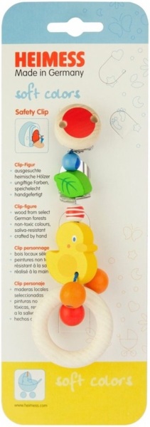 Я использую эту клипсу для пустышки Heimess, еще и в качестве погремушки. Ребенок с удовольствием ею играет. Но это и понятно, ведь она вся яркая, разукрашена в сочные цвета, чем привлекает внимание. Крепится клипса легко, ребенку самому невозможно её отстегнуть и пораниться. Теперь можно не переживать, что пустышка где-то затеряется, она надежно прикреплена. Изделие выполнено из натурального дерева, качественно обработанного. Благодаря тому, что дочка постоянно играет с этой уточкой, у нее развиваются тактильные навыки, мелкая моторика рук, зрительные данные, координация движения. Заказывала я данное изделие на этой интернет странице, по рекомендации подруги.