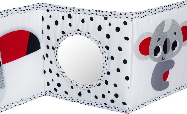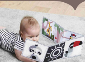- 0-3+ месяца: зрительная стимуляция. Черно-белая сторона предлагает ребенку необходимую зрительную стимуляцию с первого дня жизни. Положите книгу на удобном расстоянии от ребенка и позвольте ему попробовать сфокусировать взгляд на контрастных формах и зеркале.