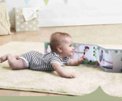 - 3-6 месяцев: общая моторика. Обе стороны будут привлекать и стимулировать ребенка на ранних и поздних стадиях развития, помогая продлить время пребывания на животике. Положите ребенка на животик так, чтобы книга была в пределах досягаемости, и позвольте ему исследовать игрушку глазами и ручками.