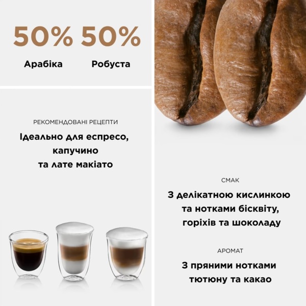 Вы можете быть заядлым кофеманом или наслаждаться этим напитком лишь изредка, но покупку кофе в зернах DeLonghi DLSC616 Classico наверняка высоко оцените в любом случае. Достойный выбор для настоящих ценителей и гурманов. Зерна арабики и робусты, собранные с любовью и профессионально расфасованные итальянскими мастерами в пропорции 50 на 50. Безупречный, насыщенный вкус с характерной горечью шоколада и кислинкой, свойственной лучшей арабике. Сбалансированный и не слишком приторный. Аромат табака и какао. Напиток, получаемый из этих зерен, можно наслаждаться каждый раз, с каждой порцией открывая для себя новые грани совершенства. Именно такой продукт полностью способен раскрыть весь потенциал вашей кофемашины или кофеварки.