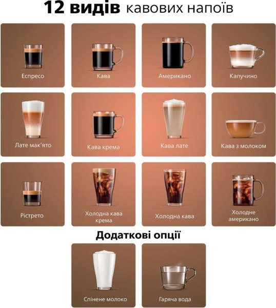 12 рецептов включают согревающие душу напитки, такие как эспрессо, латте и капучино, а также освежающий кофе со льдом. Система заваривания усовершенствована так, чтобы даже кофе со льдом имел такой же изысканный вкус, как и горячие напитки.